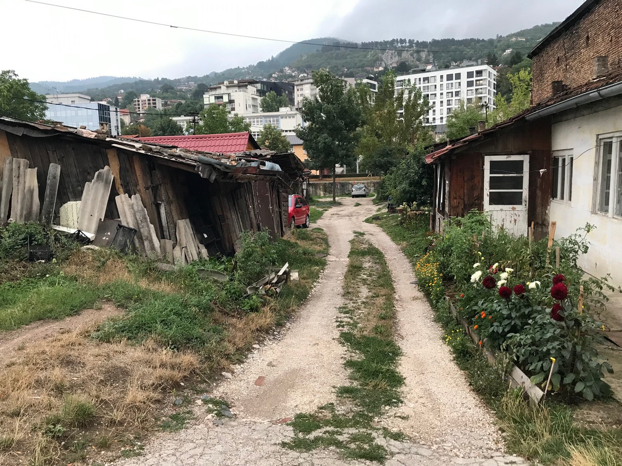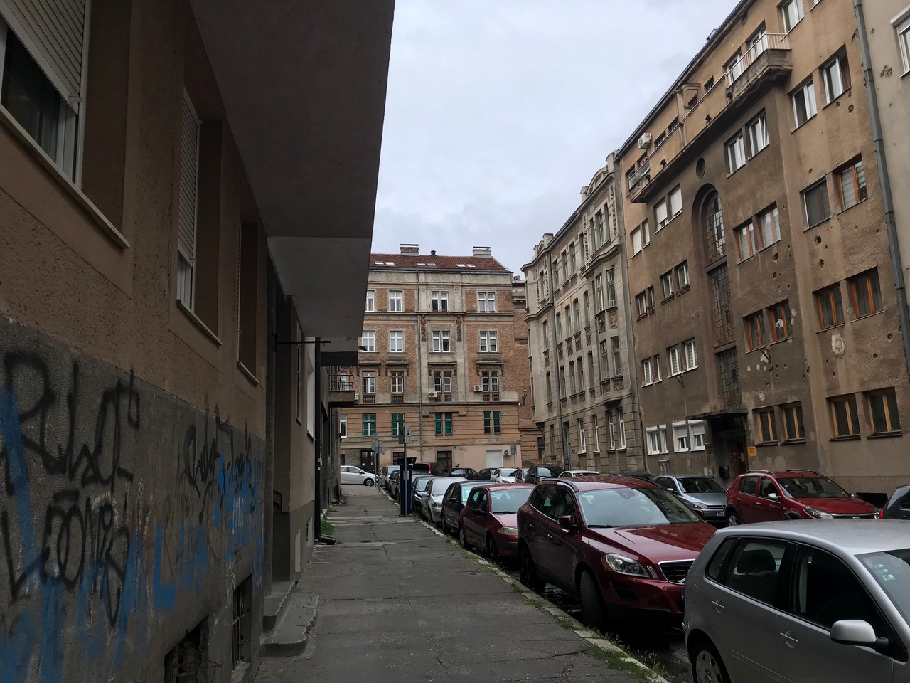 Alentours des bâtiments en ruine, des palissades taguées voisinent avec des immeubles austro-hongrois entièrement rénovés.