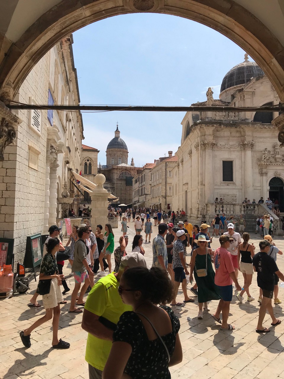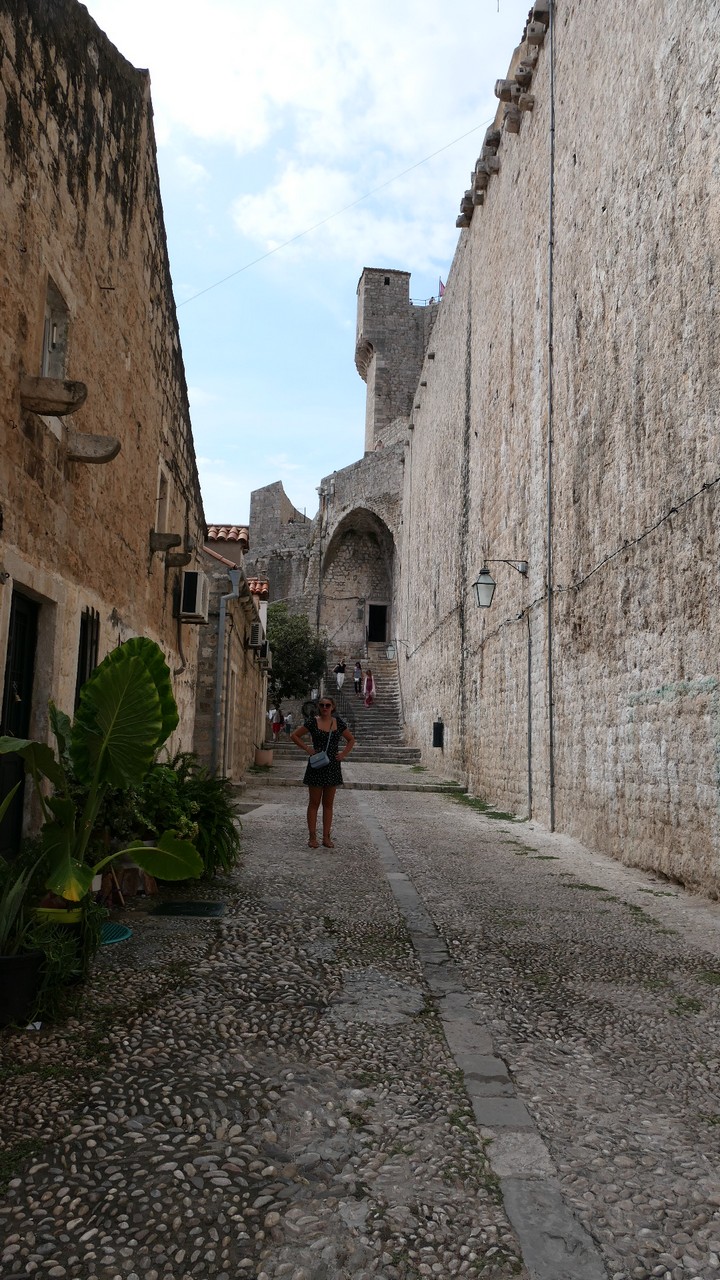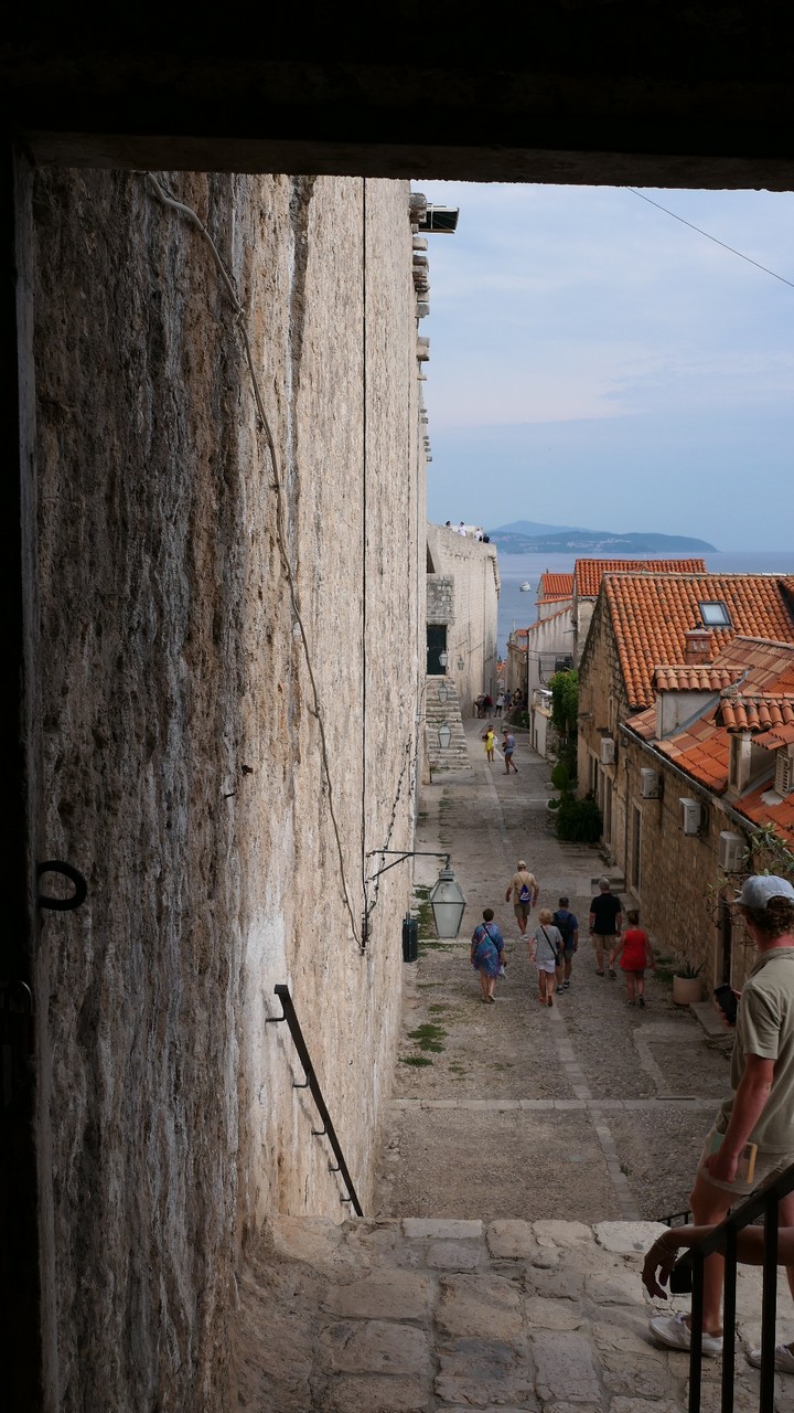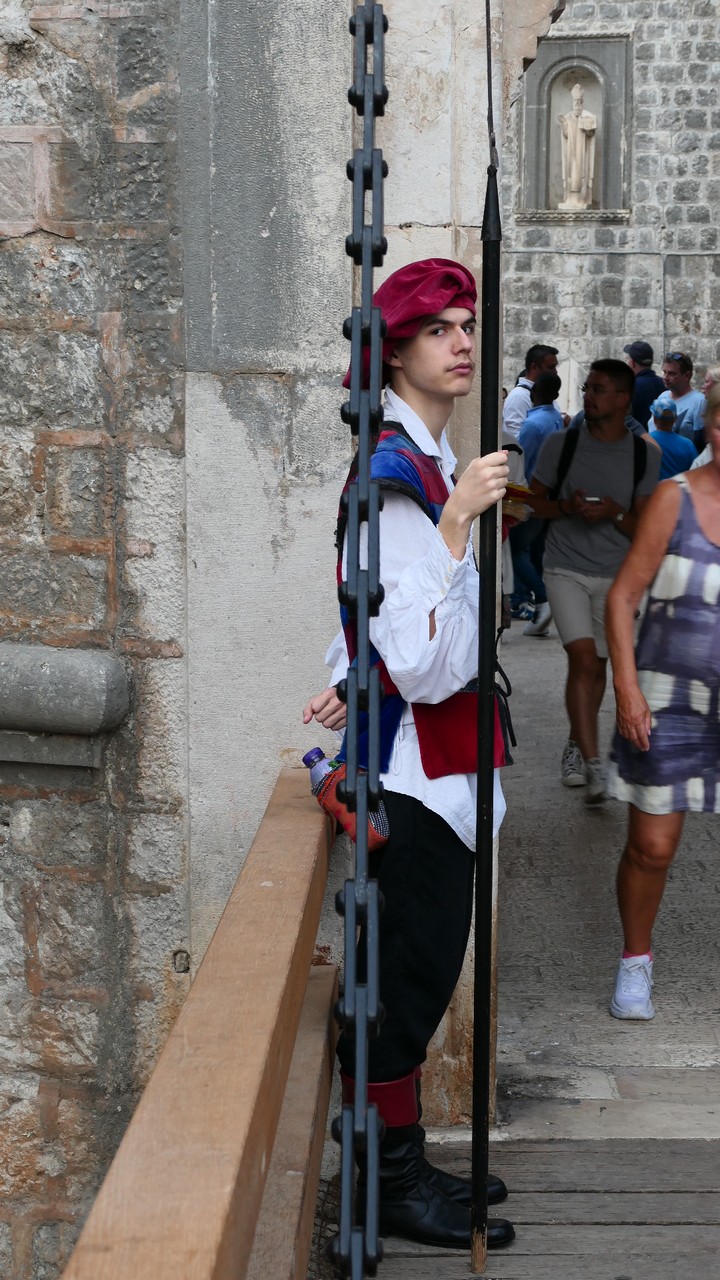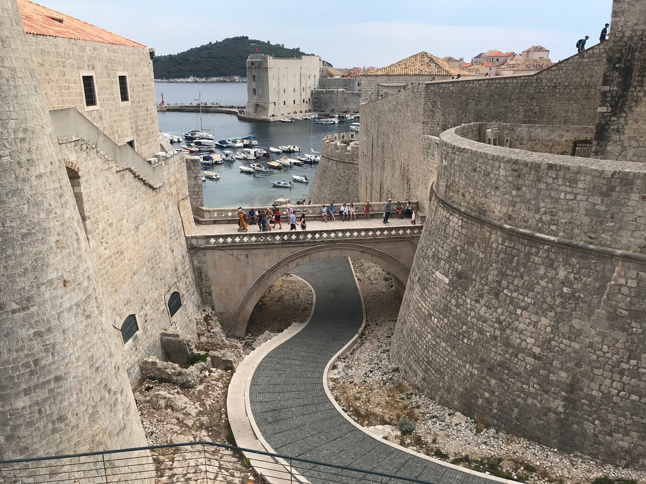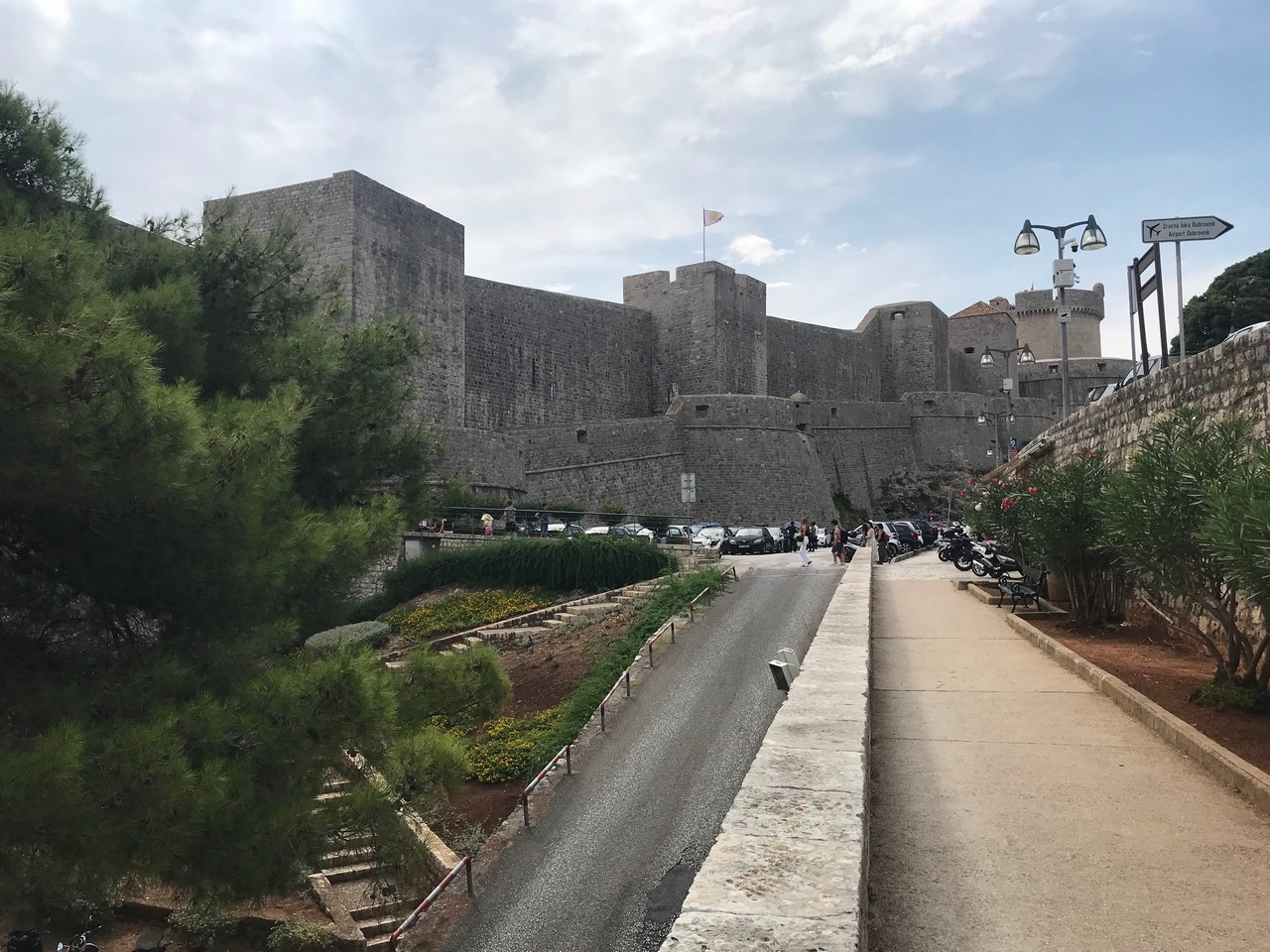 Après dix minutes de marche, on prend le bus qui nous dépose à la grande porte d’entrée de Dubrovnik qui déroule ses remparts au bord de la mer Adriatique.