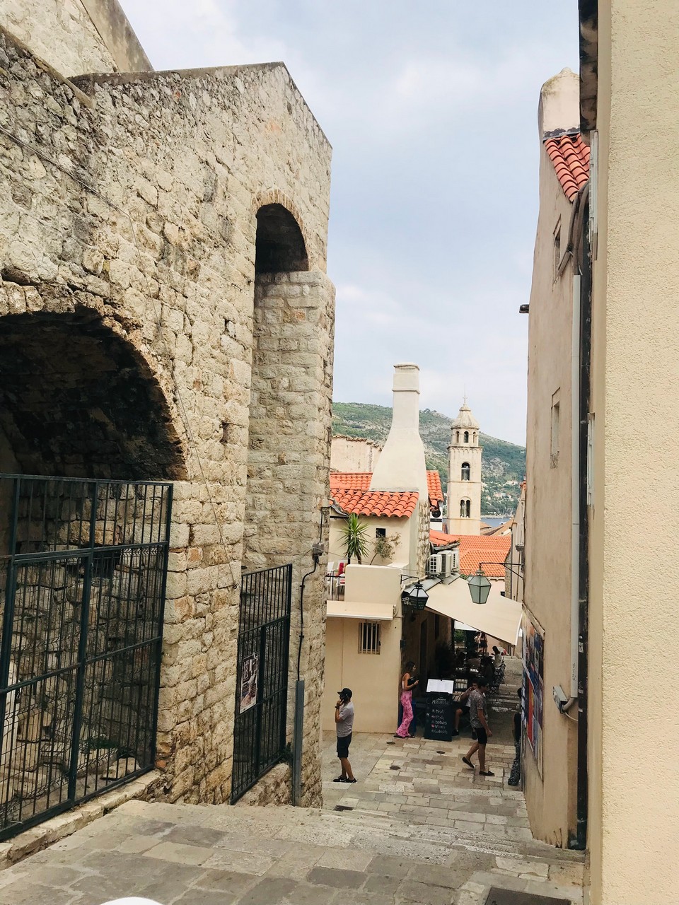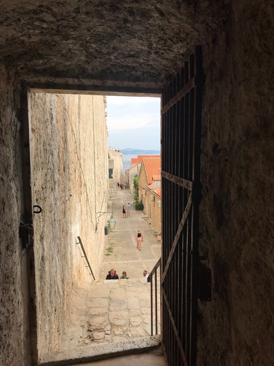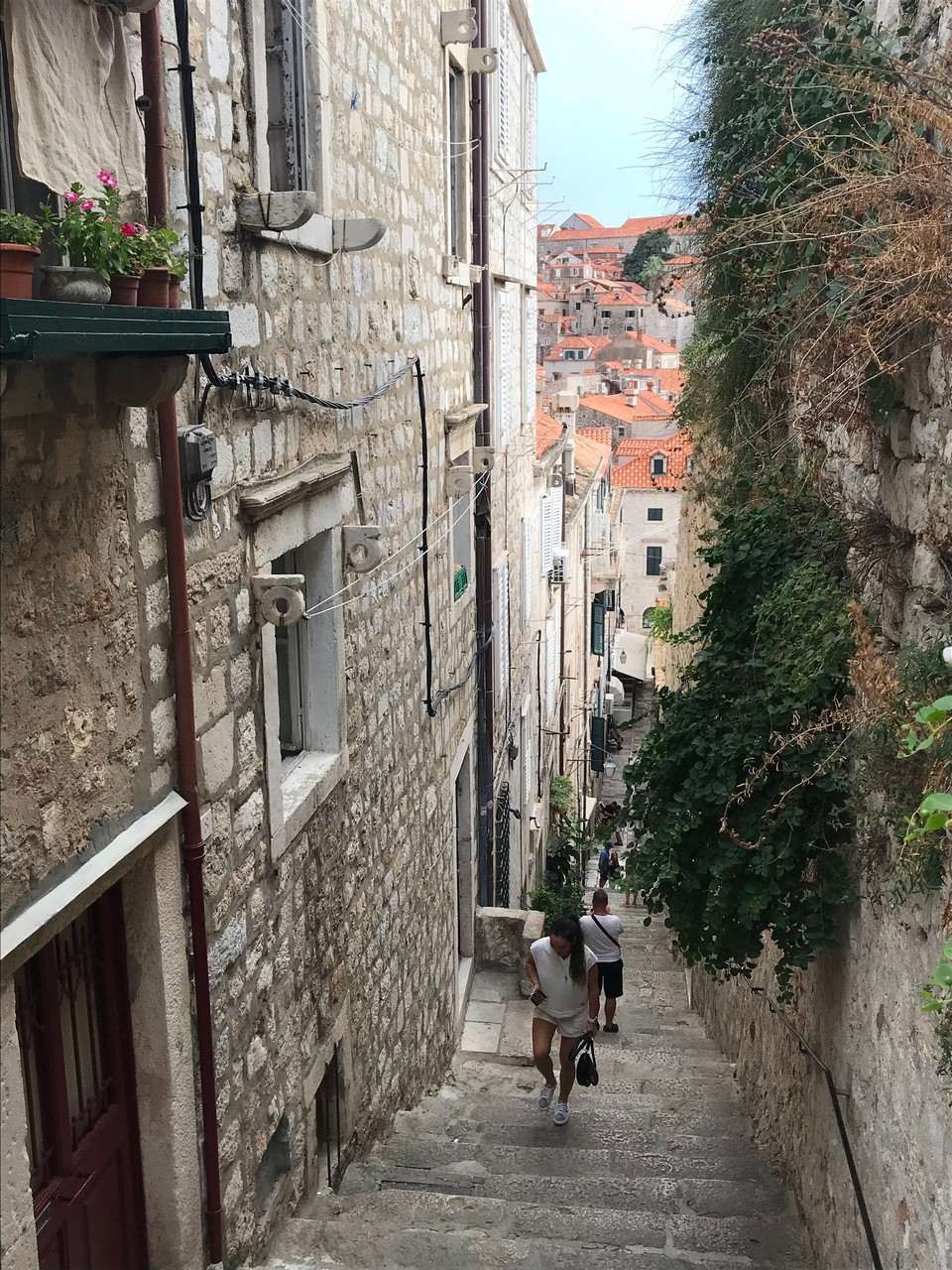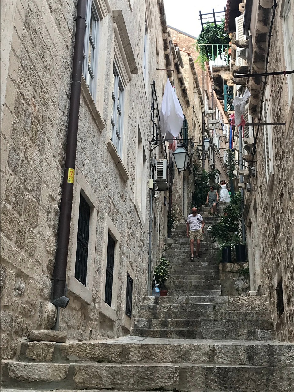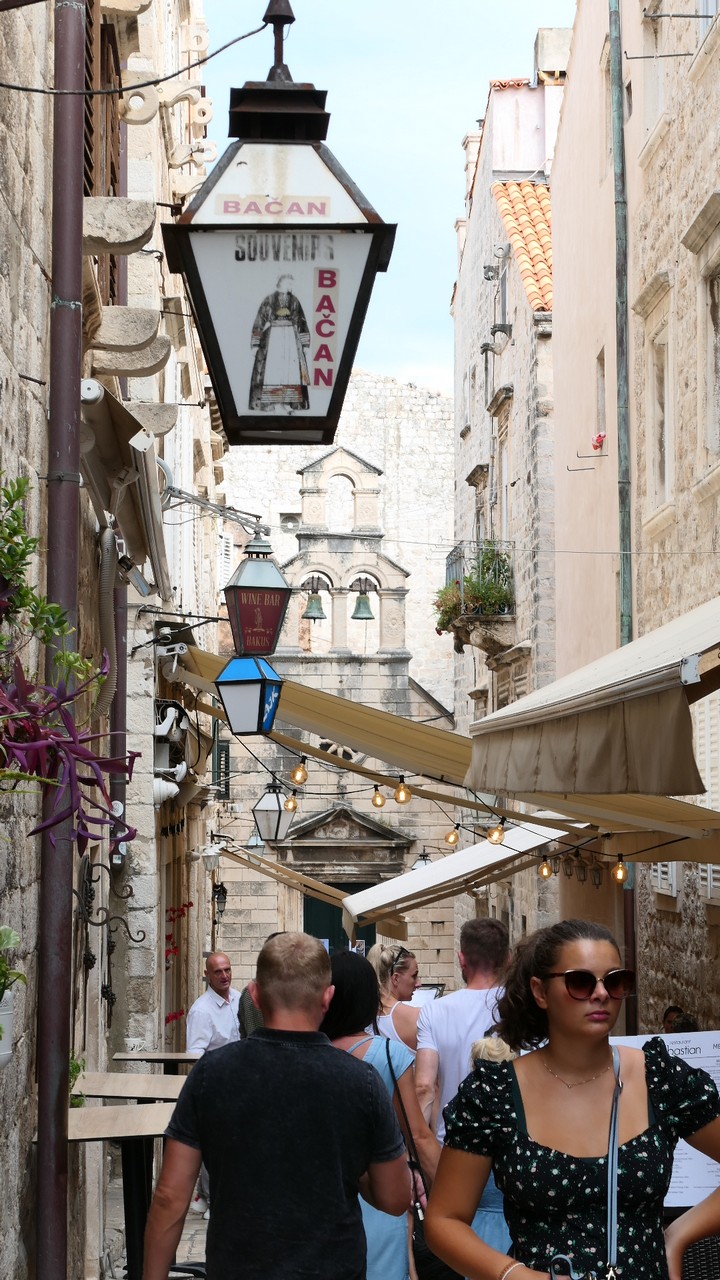 Après dix minutes de marche, on prend le bus qui nous dépose à la grande porte d’entrée de Dubrovnik qui déroule ses remparts au bord de la mer Adriatique.