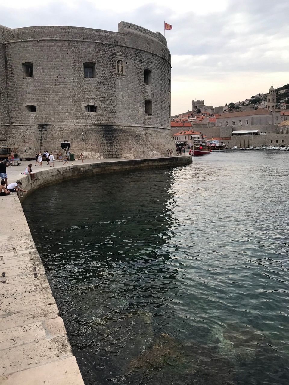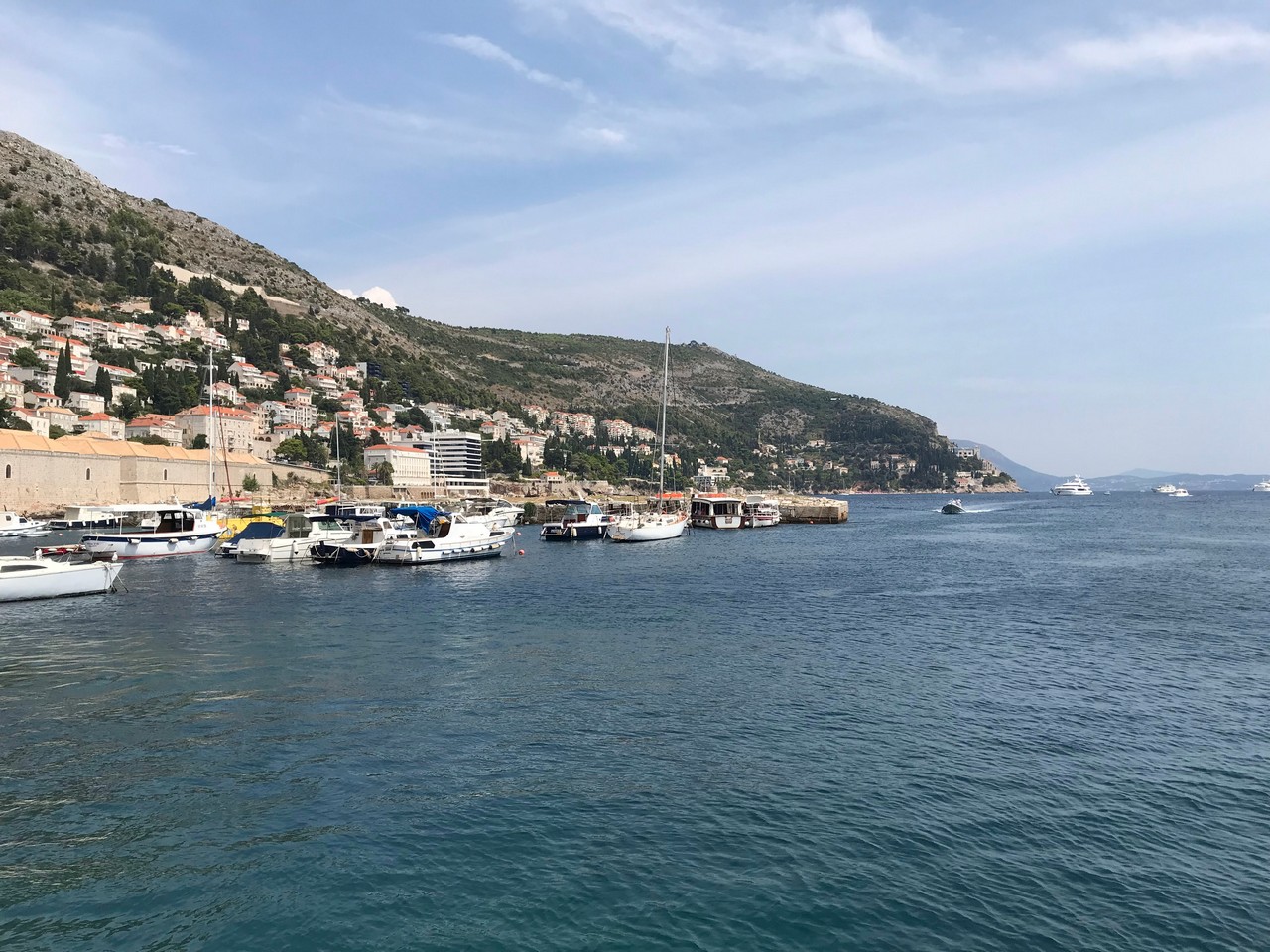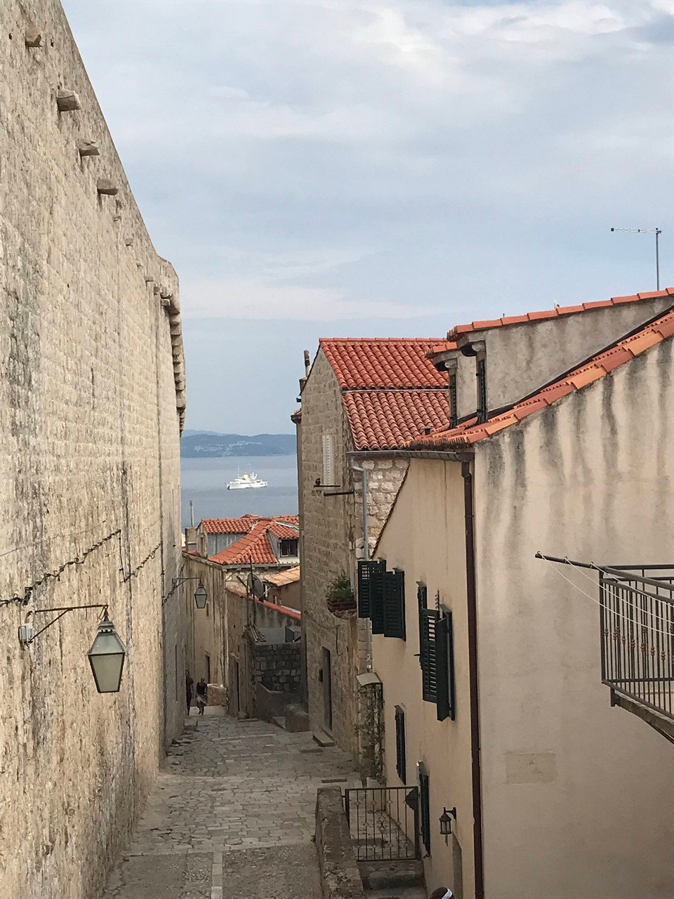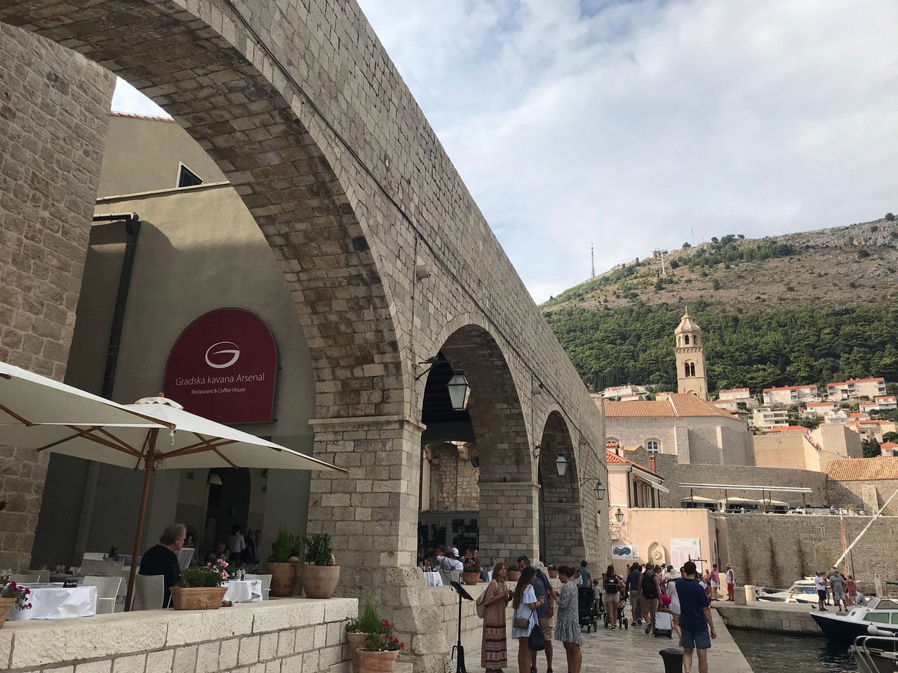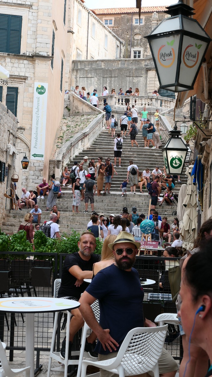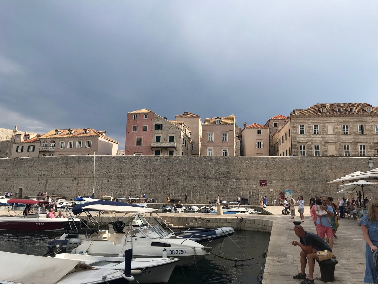 Après dix minutes de marche, on prend le bus qui nous dépose à la grande porte d’entrée de Dubrovnik qui déroule ses remparts au bord de la mer Adriatique.
