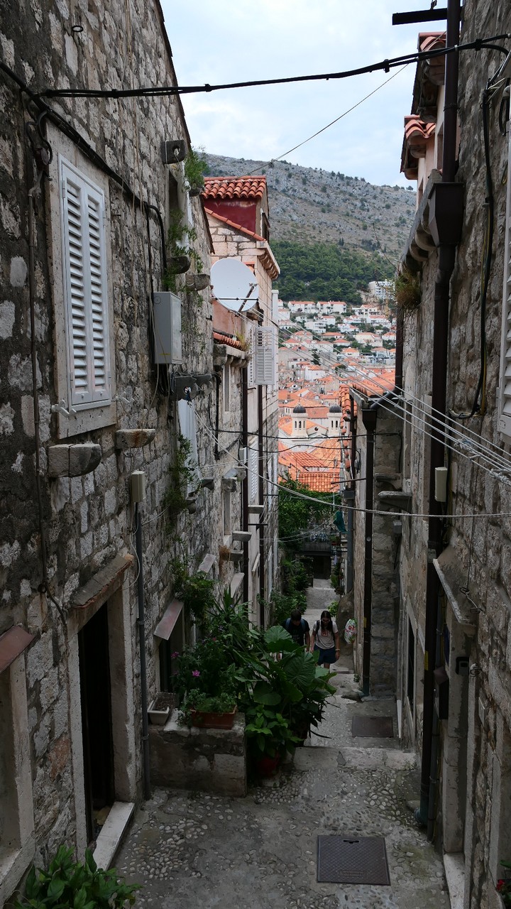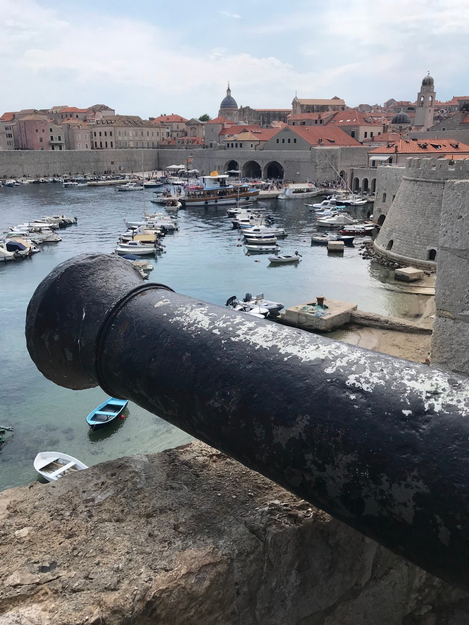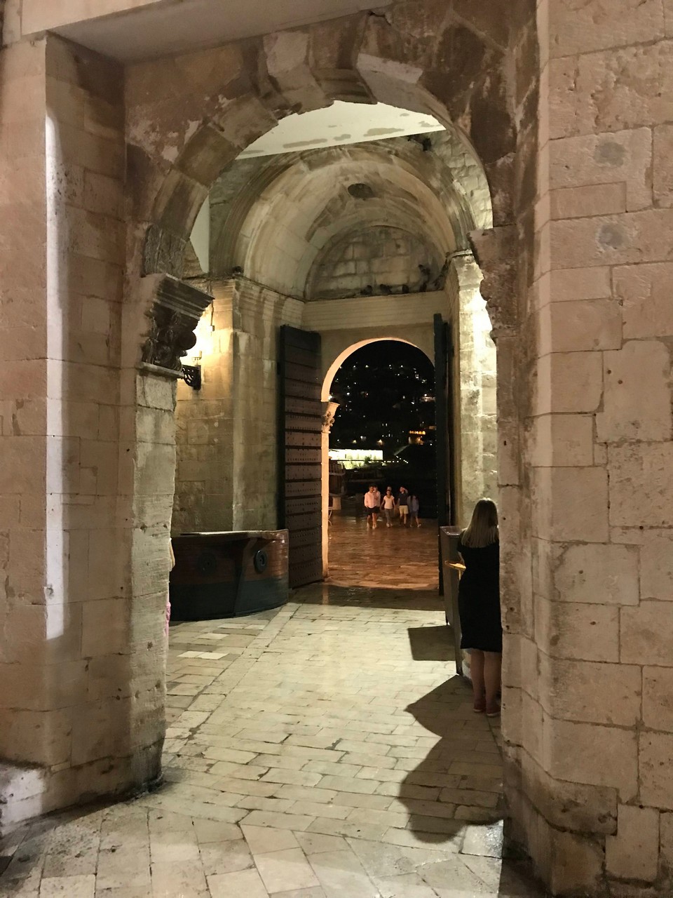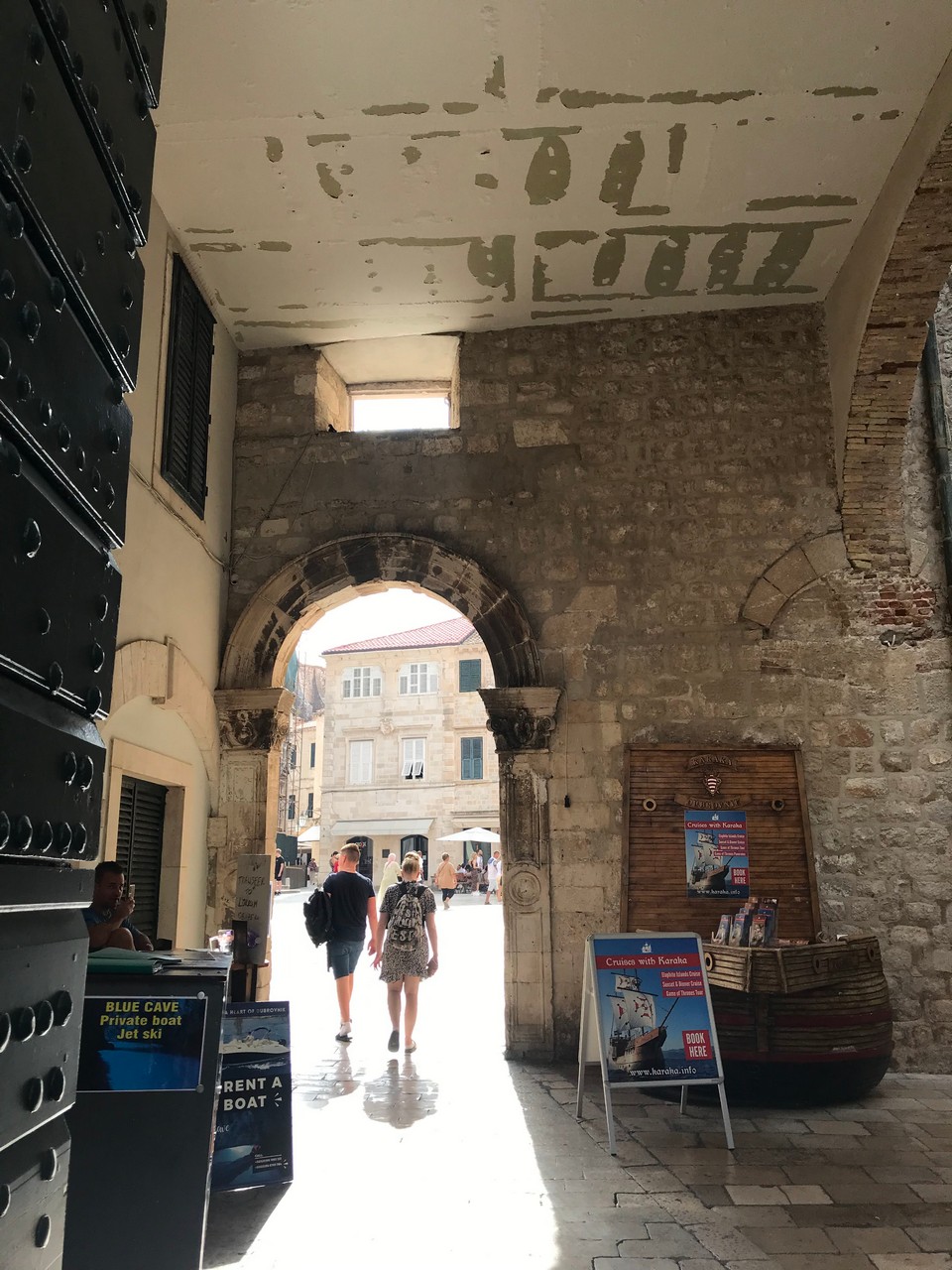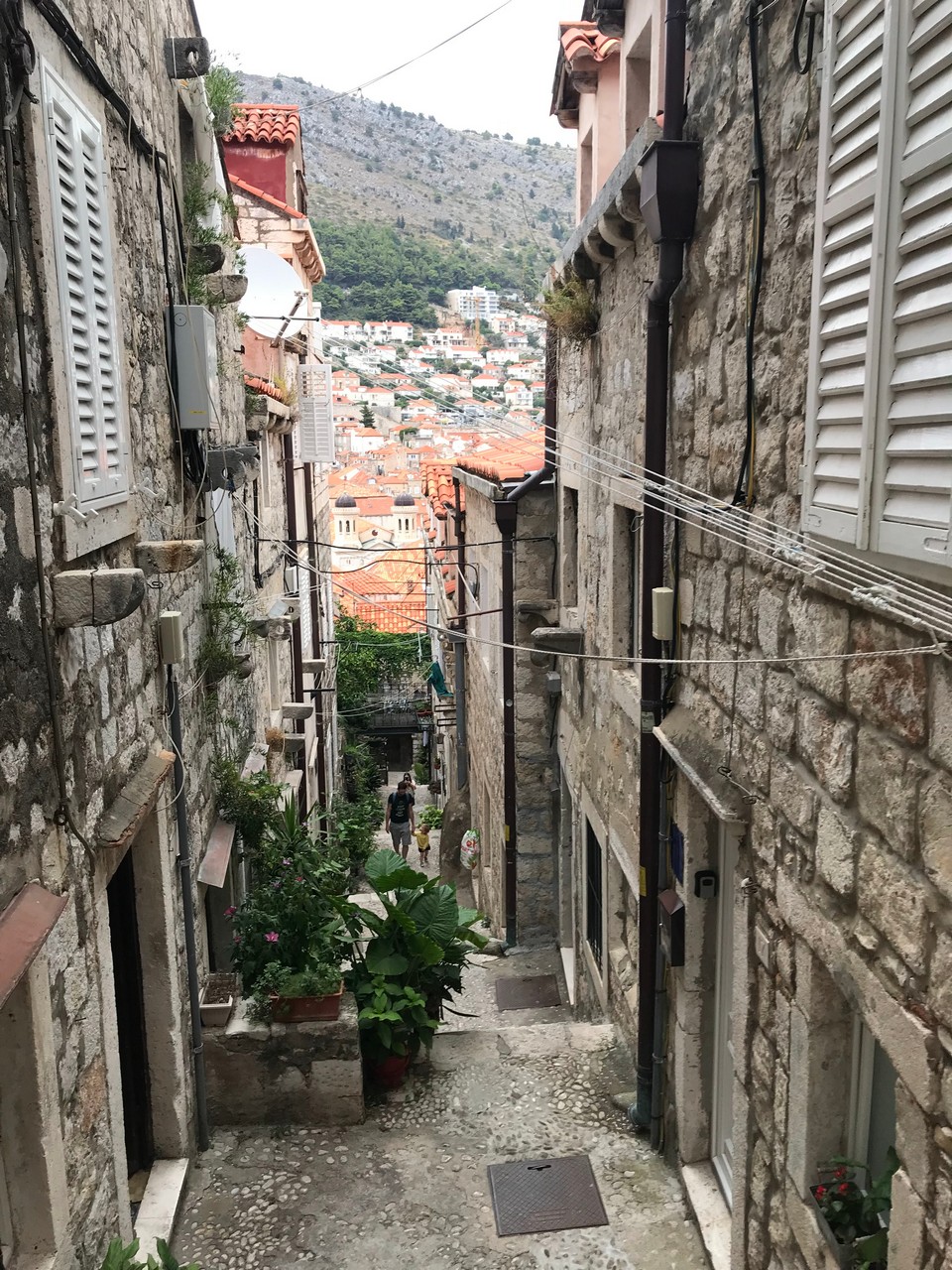 Après dix minutes de marche, on prend le bus qui nous dépose à la grande porte d’entrée de Dubrovnik qui déroule ses remparts au bord de la mer Adriatique.