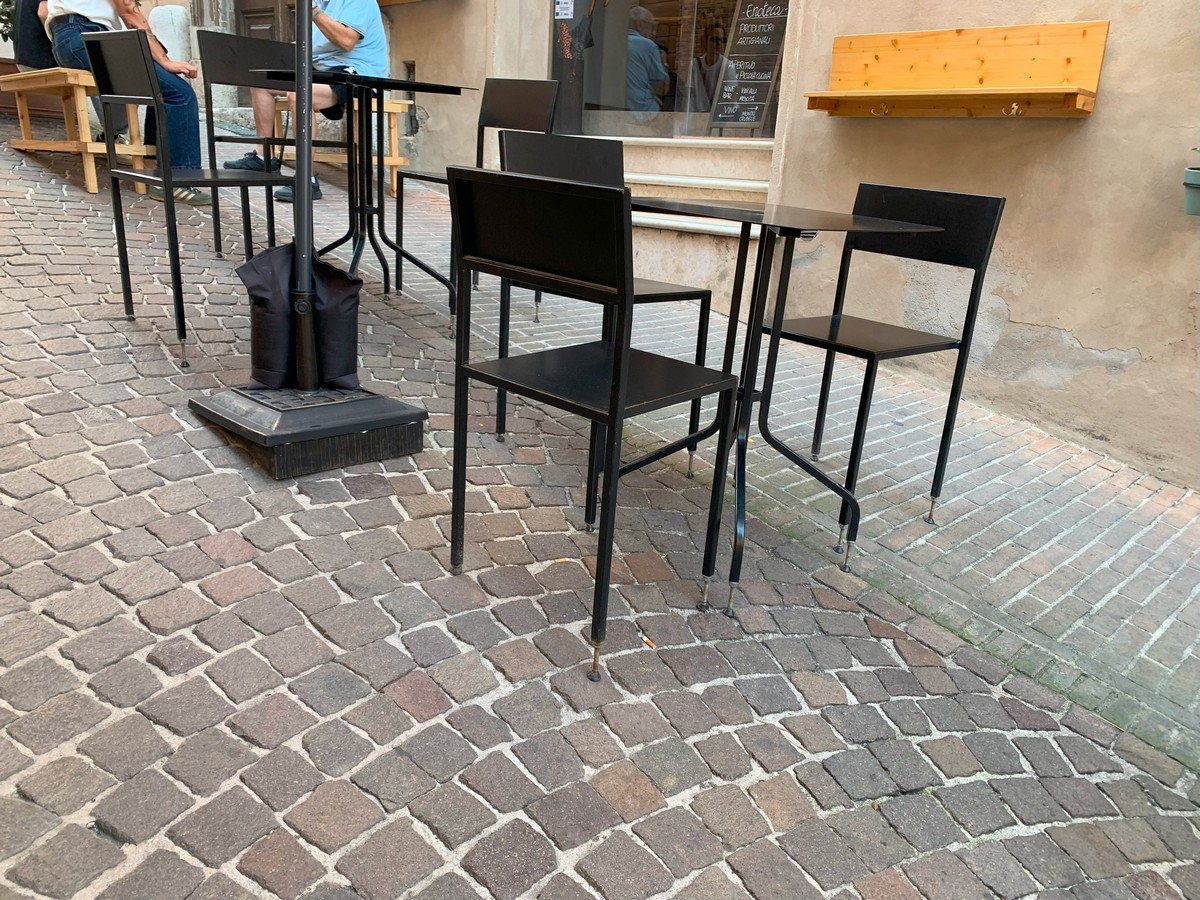 On trouve un resto, la terrasse en pente sévère, toutes les chaises et les tables ont des supports adaptés pour rattraper l’horizontalité.