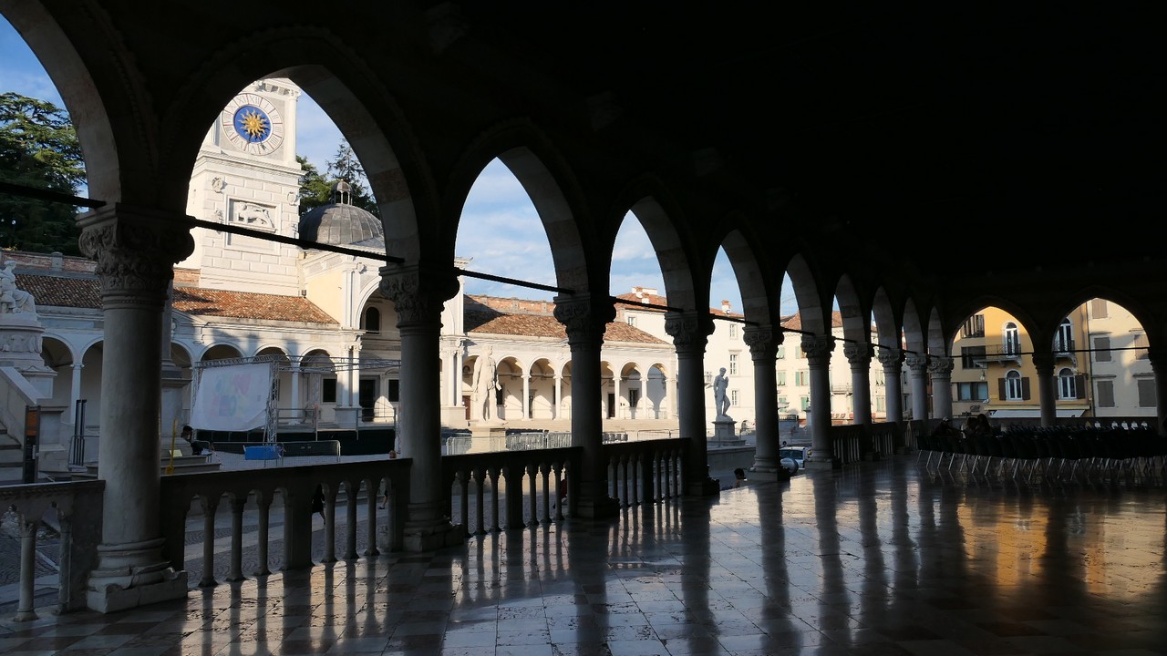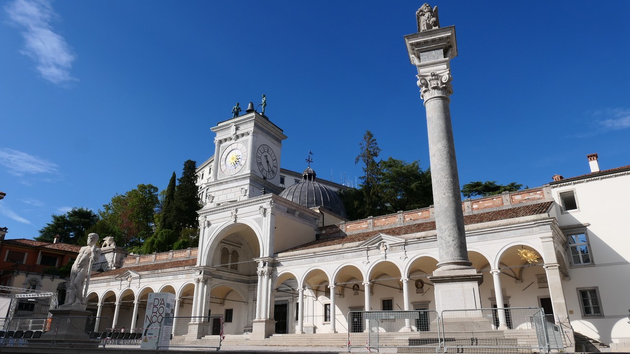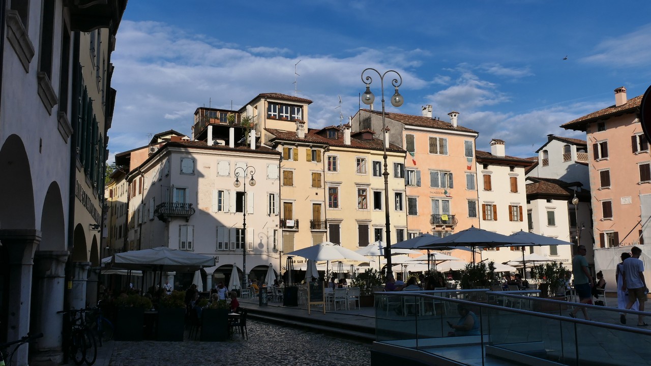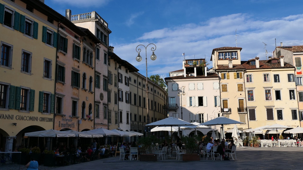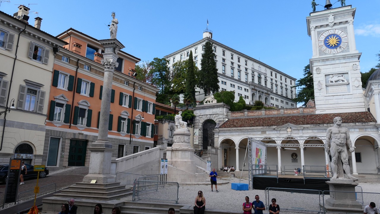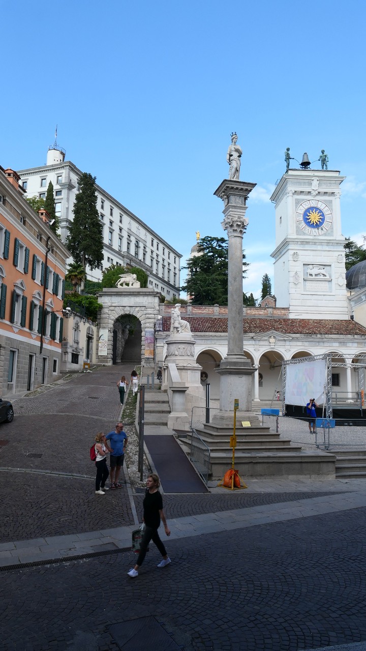 Voici Udine. Parking en bordure de la ville fortifiée, on entame la visite. Petite cité pleine de charme et de caractère qui a conservé une belle architecture médiévale et vénitienne. On monte au château pour admirer le panorama sur les Alpes.