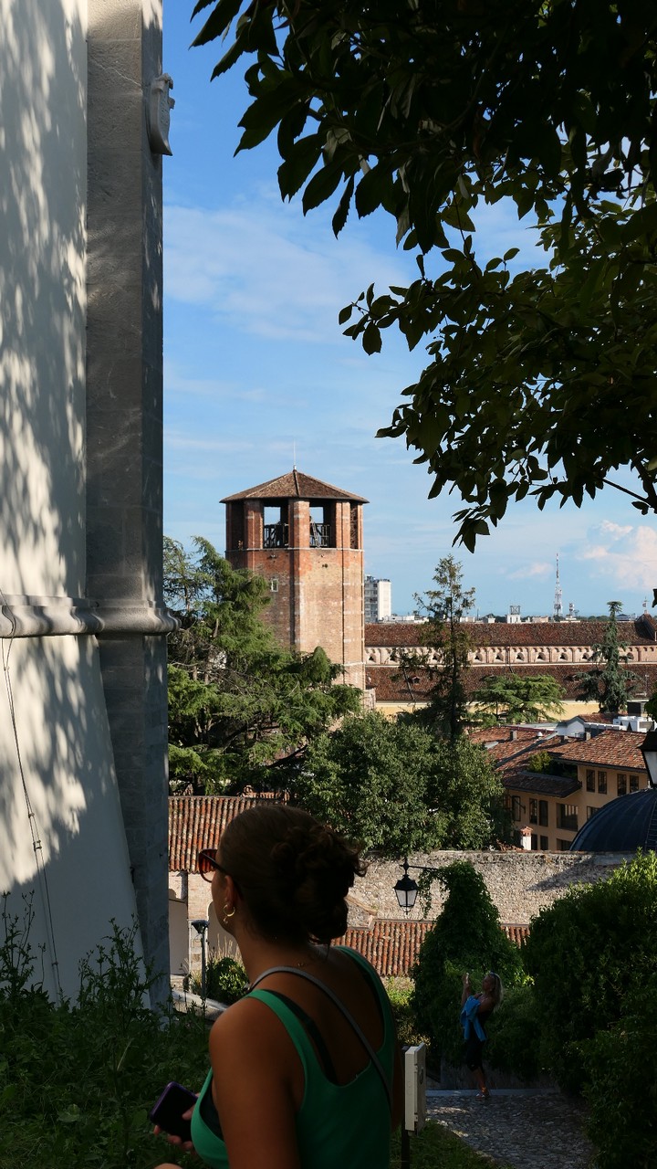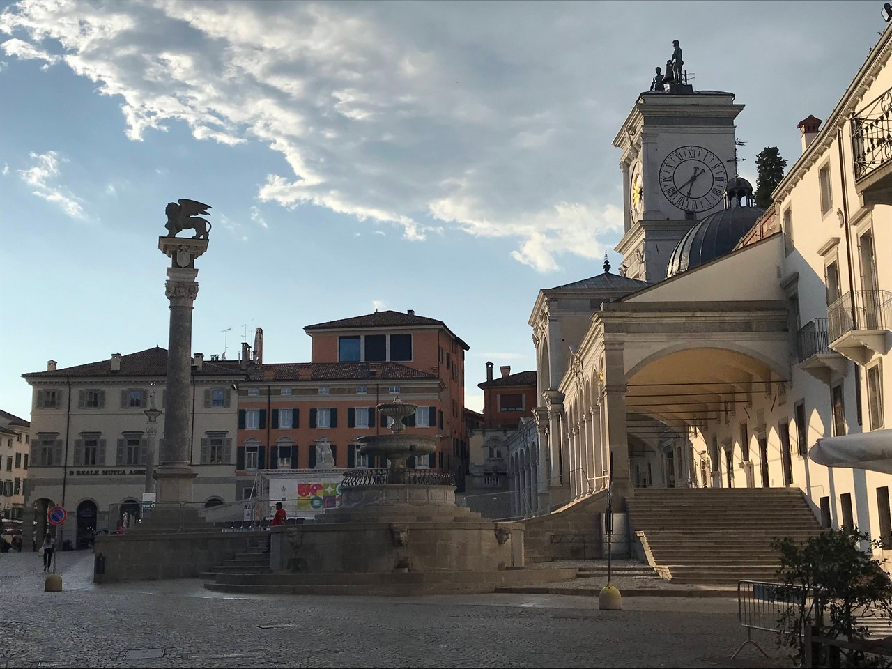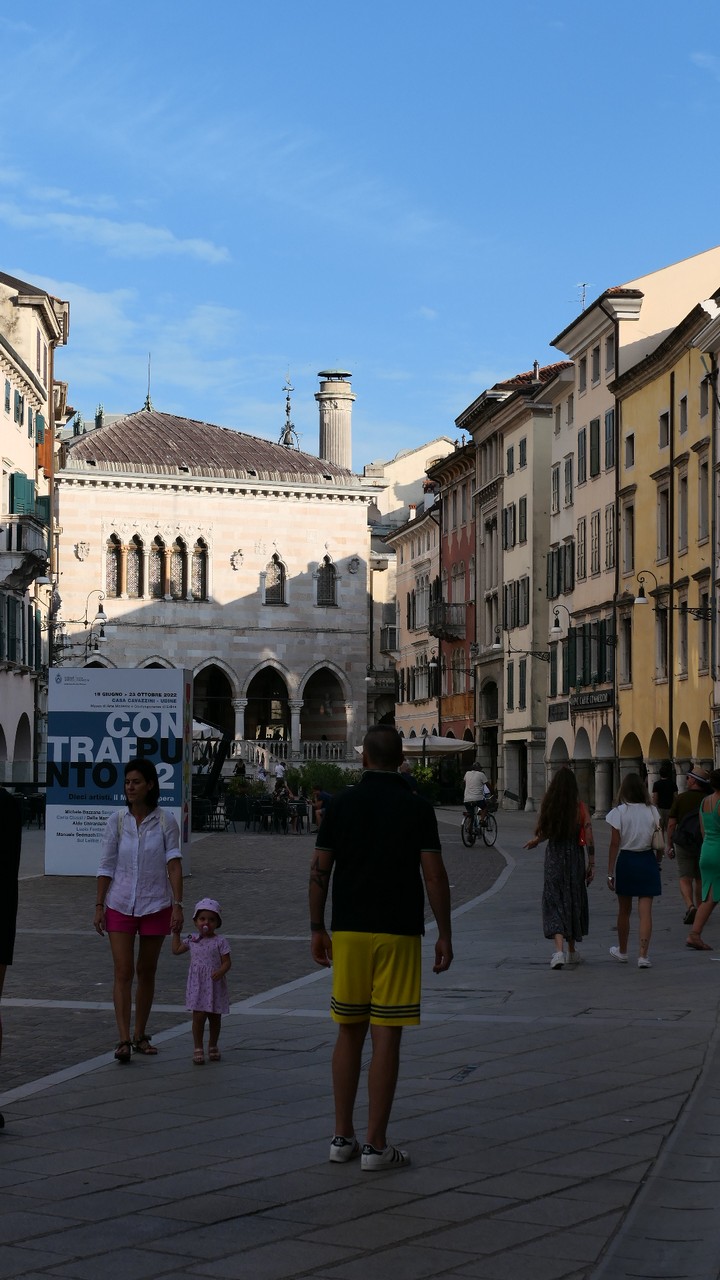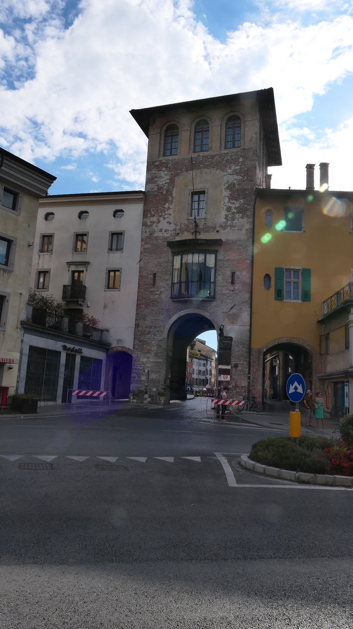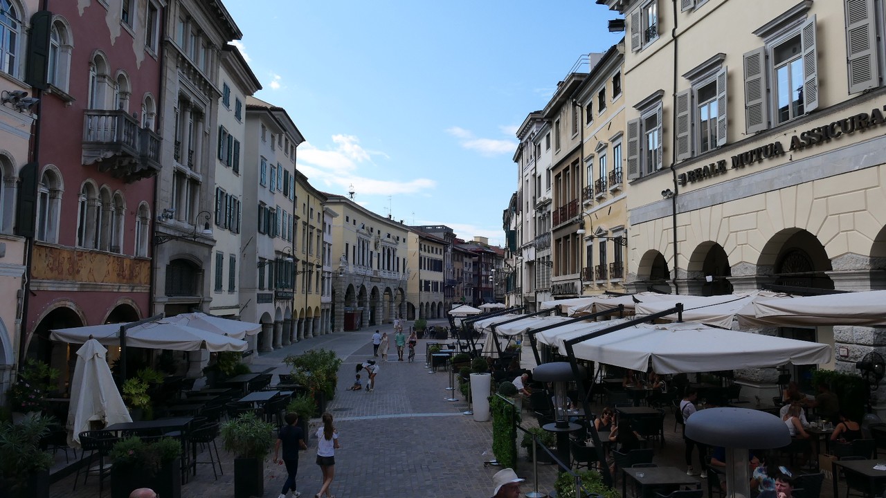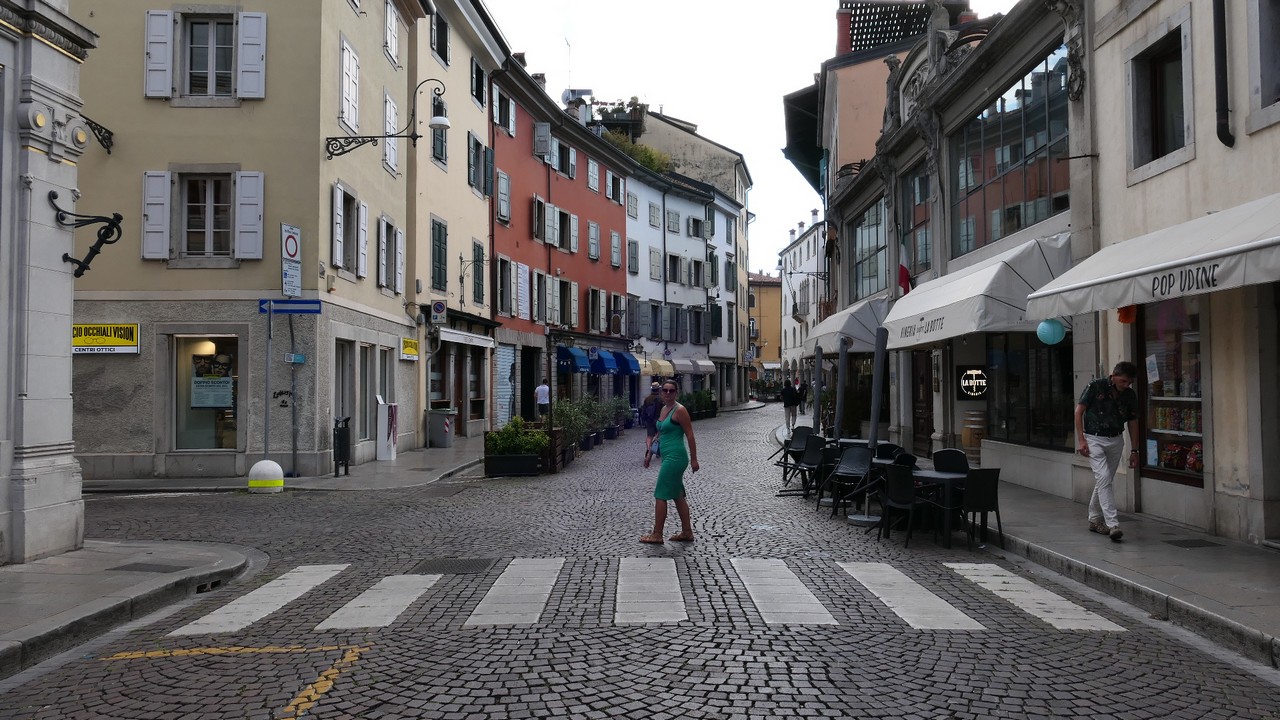Voici Udine. Parking en bordure de la ville fortifiée, on entame la visite. Petite cité pleine de charme et de caractère qui a conservé une belle architecture médiévale et vénitienne. On monte au château pour admirer le panorama sur les Alpes.