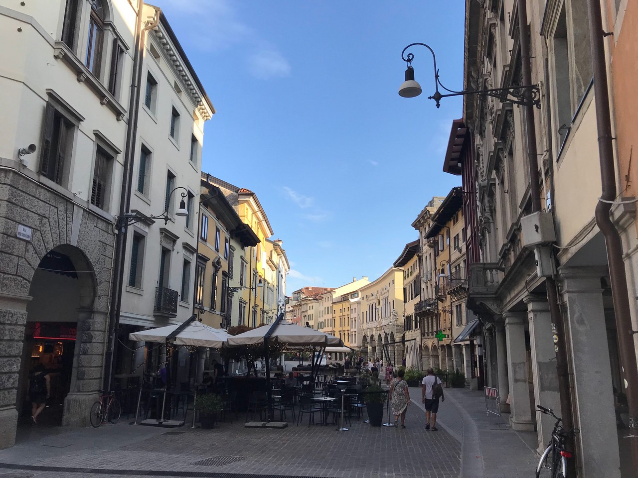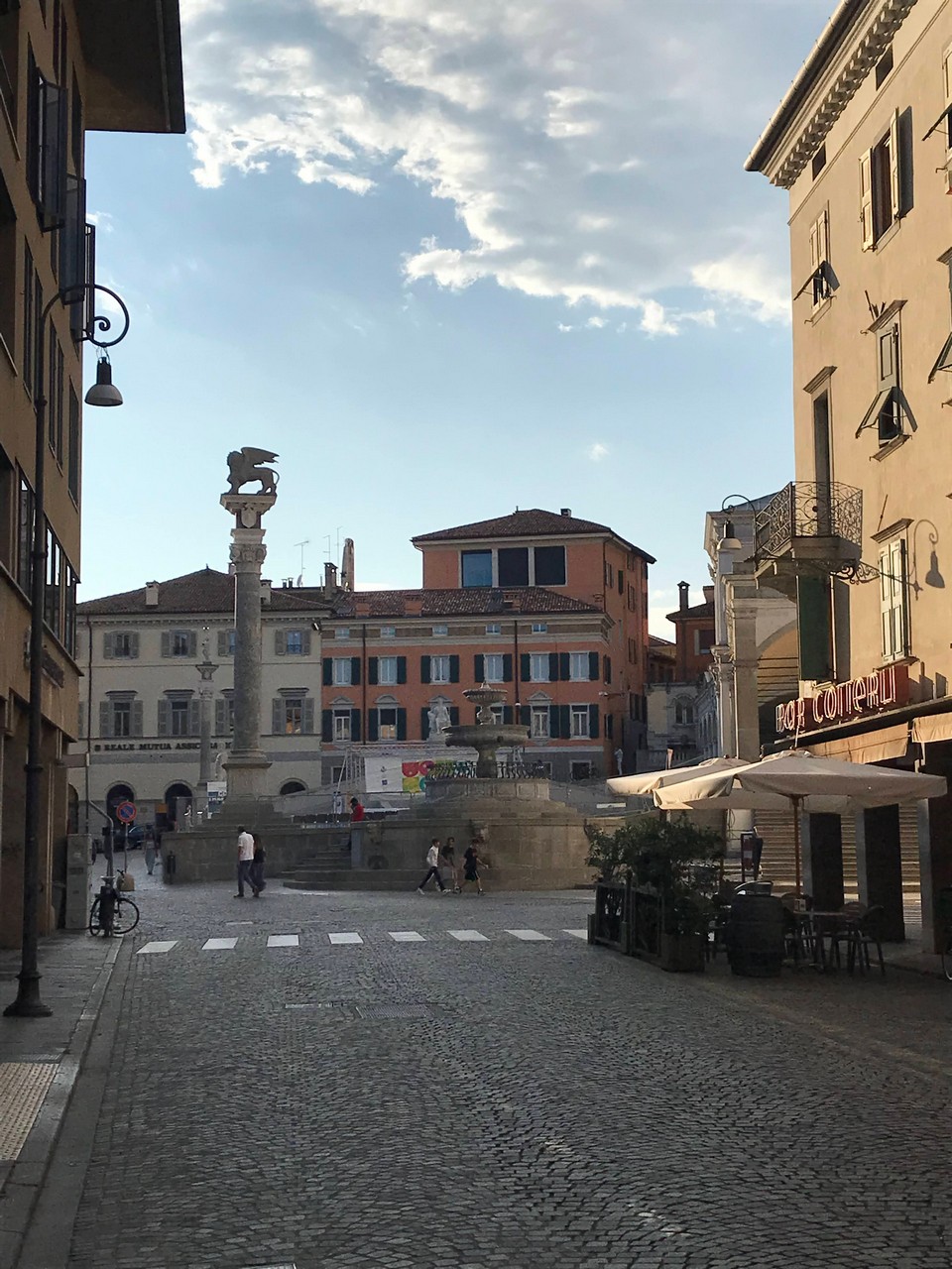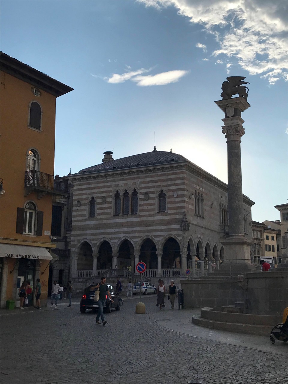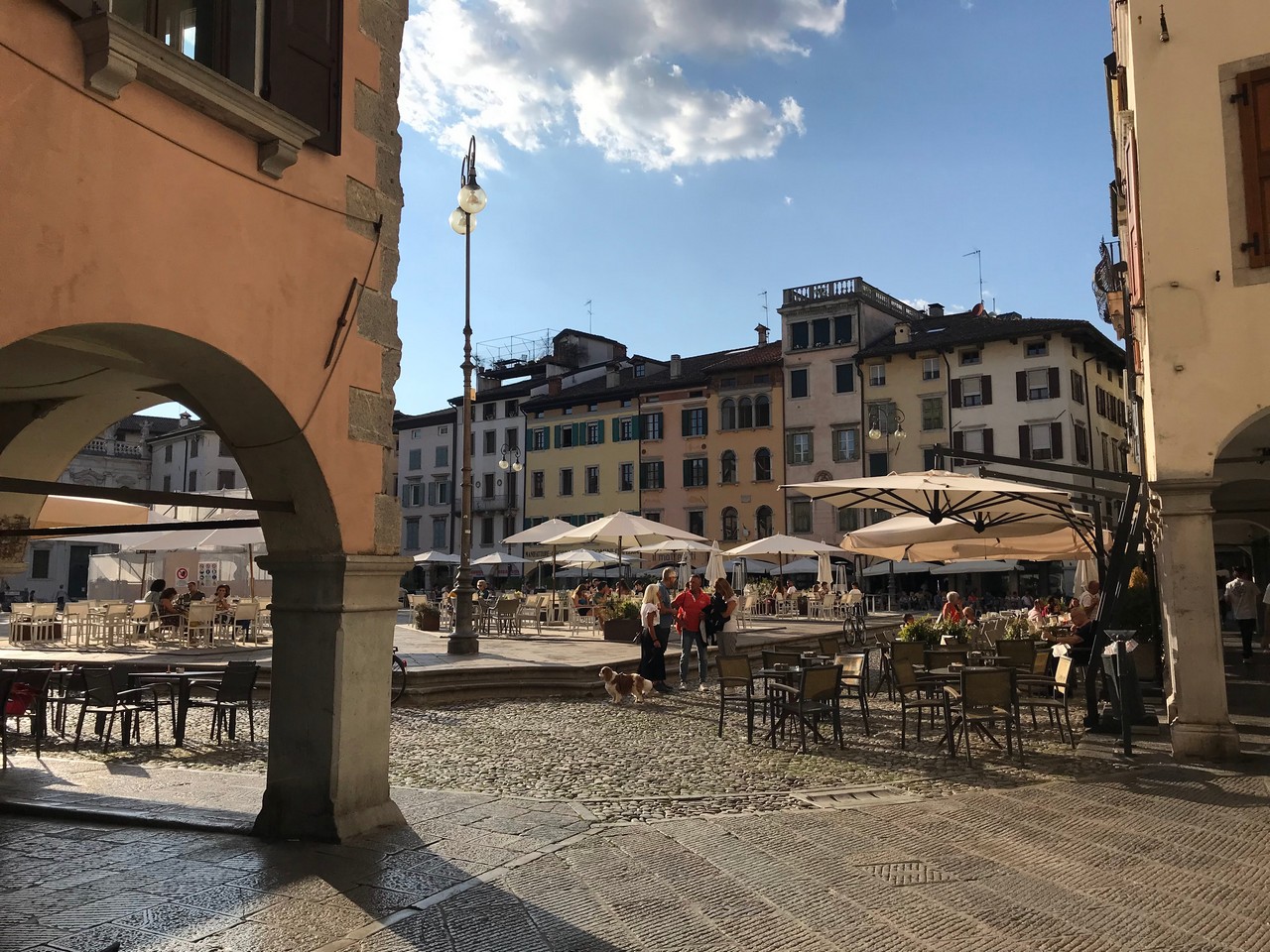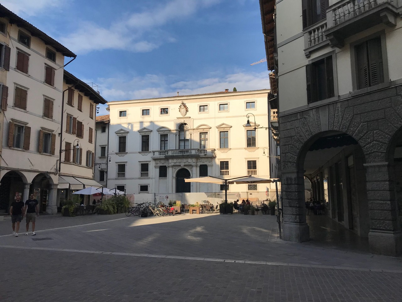 Voici Udine. Parking en bordure de la ville fortifiée, on entame la visite. Petite cité pleine de charme et de caractère qui a conservé une belle architecture médiévale et vénitienne. On monte au château pour admirer le panorama sur les Alpes.